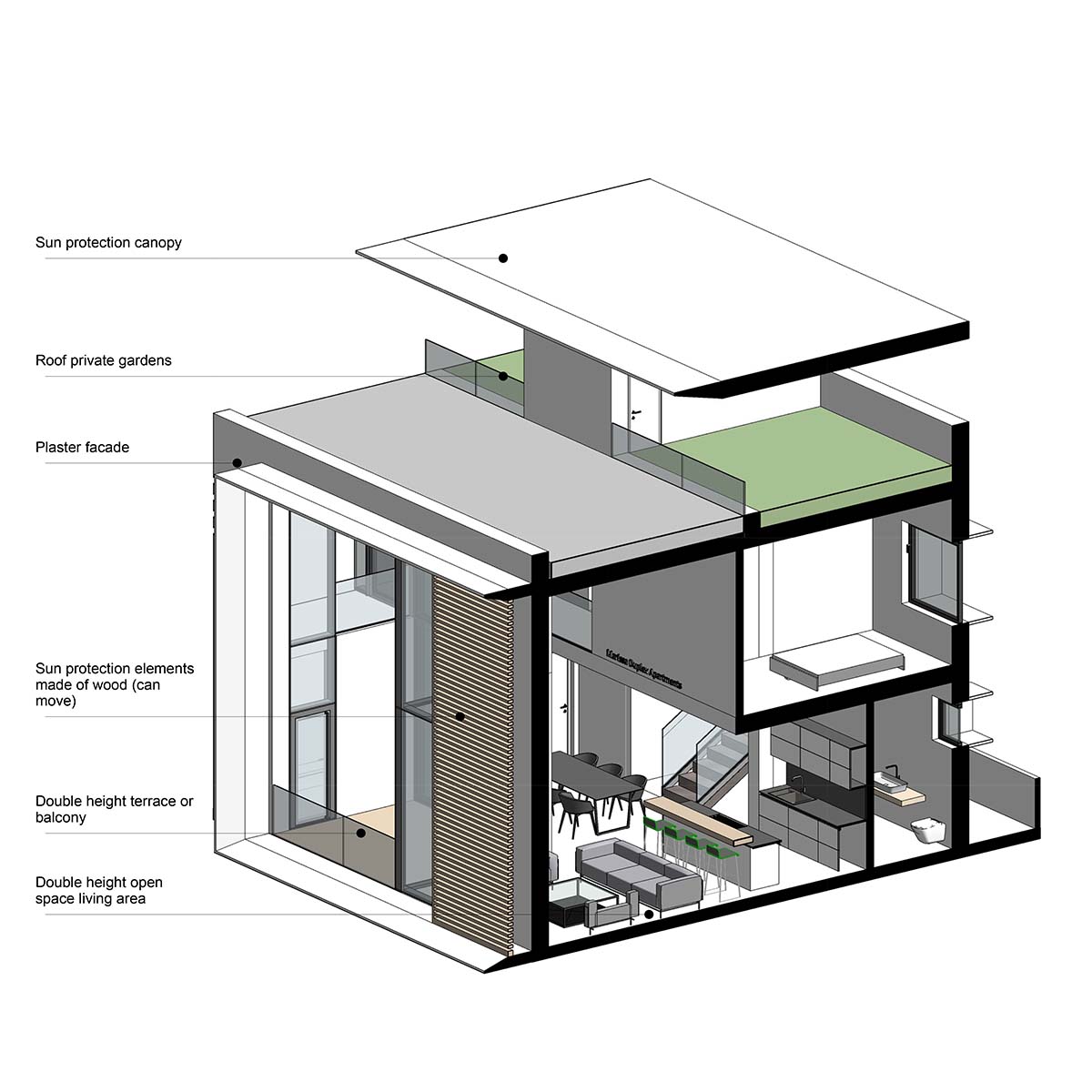 Концепция комплекса объединяет современный дизайн и в то же время связь с традиционной местной архитектурой. Высокие двухсветные гостиные погружают жителей в атмосферу простора и свободы. Панорамные окна, простирающиеся от пола до потолка, открывают захватывающие виды на ночное небо, усыпанное звездами.
