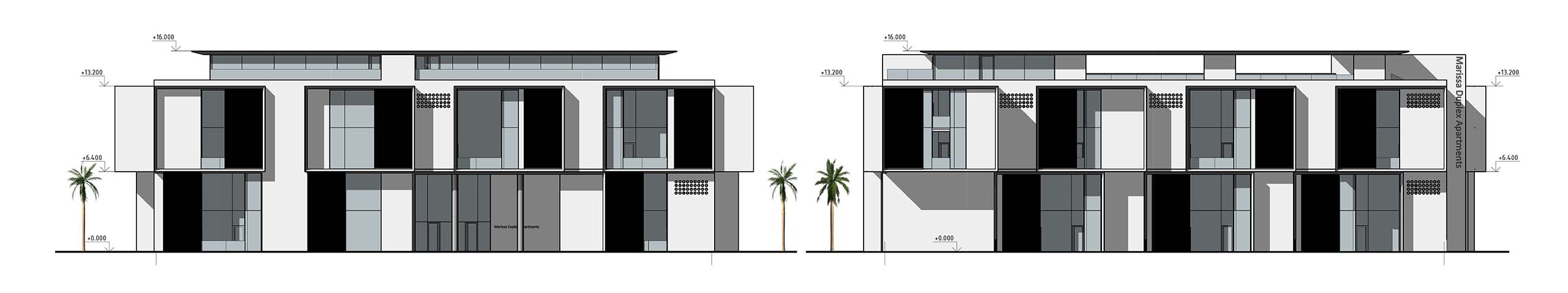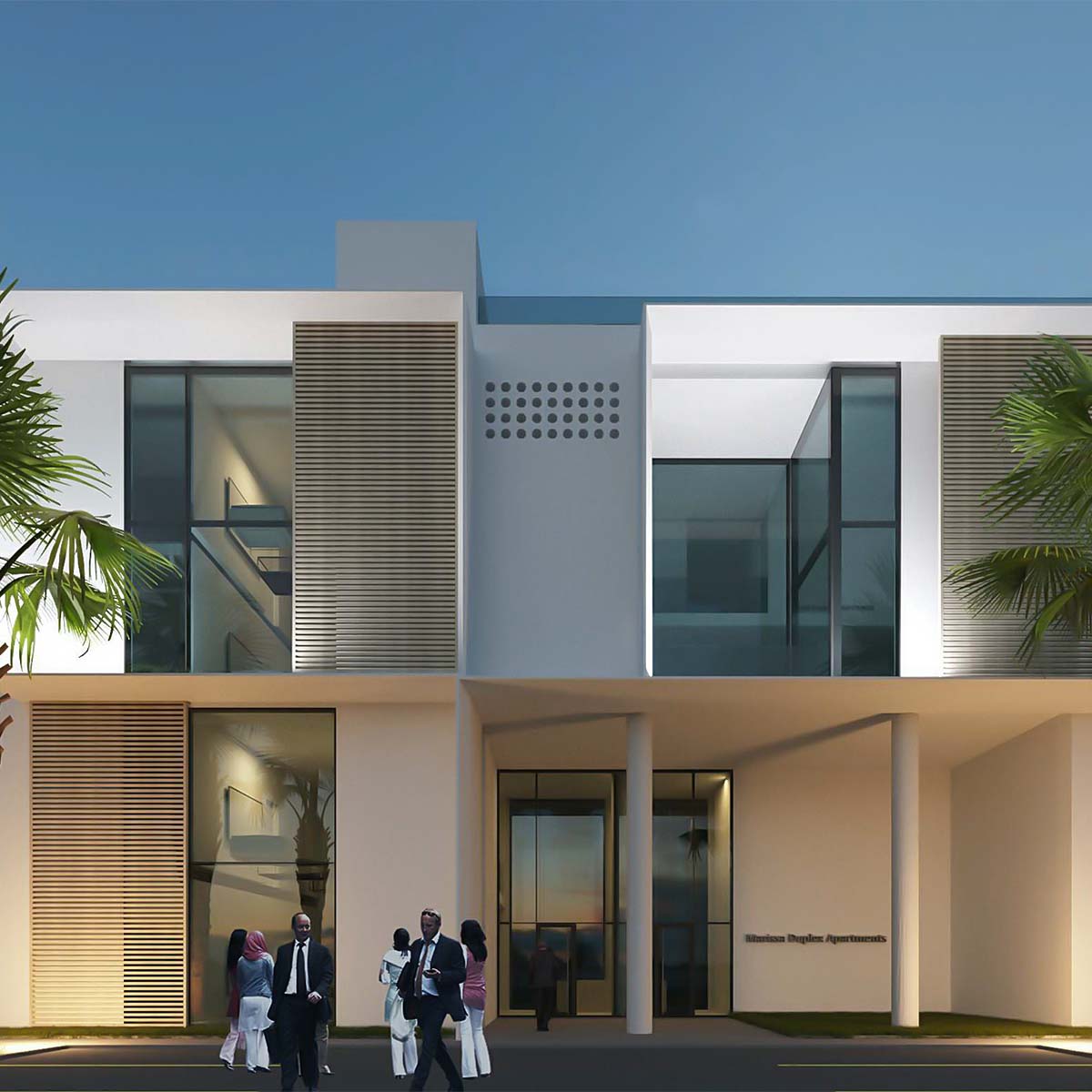 Фасады зданий выполнены в строгих геометрических формах, но с тонкими элементами арабского орнамента, словно тень на песке, появляющаяся на закате. Гладкие поверхности сочетаются с вставками дерева, создавая игру света и тени. Цветовая гамма комплекса — мягкие белоснежные поверхности и стеклянные панели, которые отражают небо, наполняя пространство изменяющимися оттенками дня.