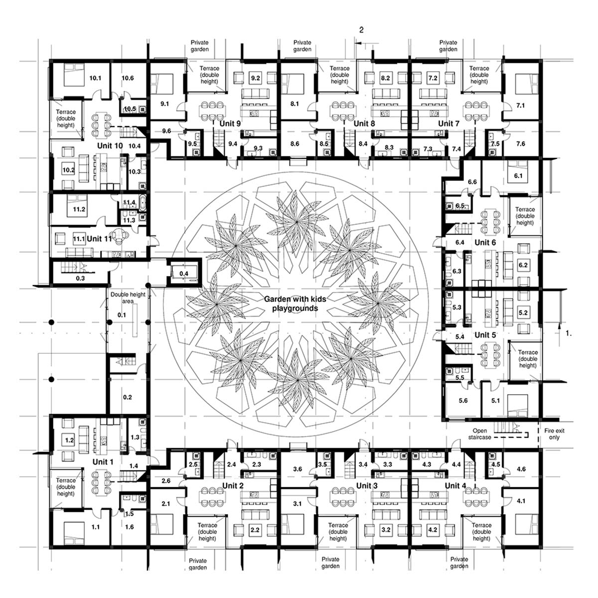 Сердце комплекса - его внутренний двор — это настоящее убежище от городской суеты. Здесь шум мегаполиса уступает место шепоту воды, плеску небольших фонтанов и шелесту пальмовых листьев. Двор задуман как оазис: с тенистыми перголами, зелеными насаждениями и уютными зонами отдыха. Здесь жители могут встречаться, отдыхать, или просто наслаждаться покоем.