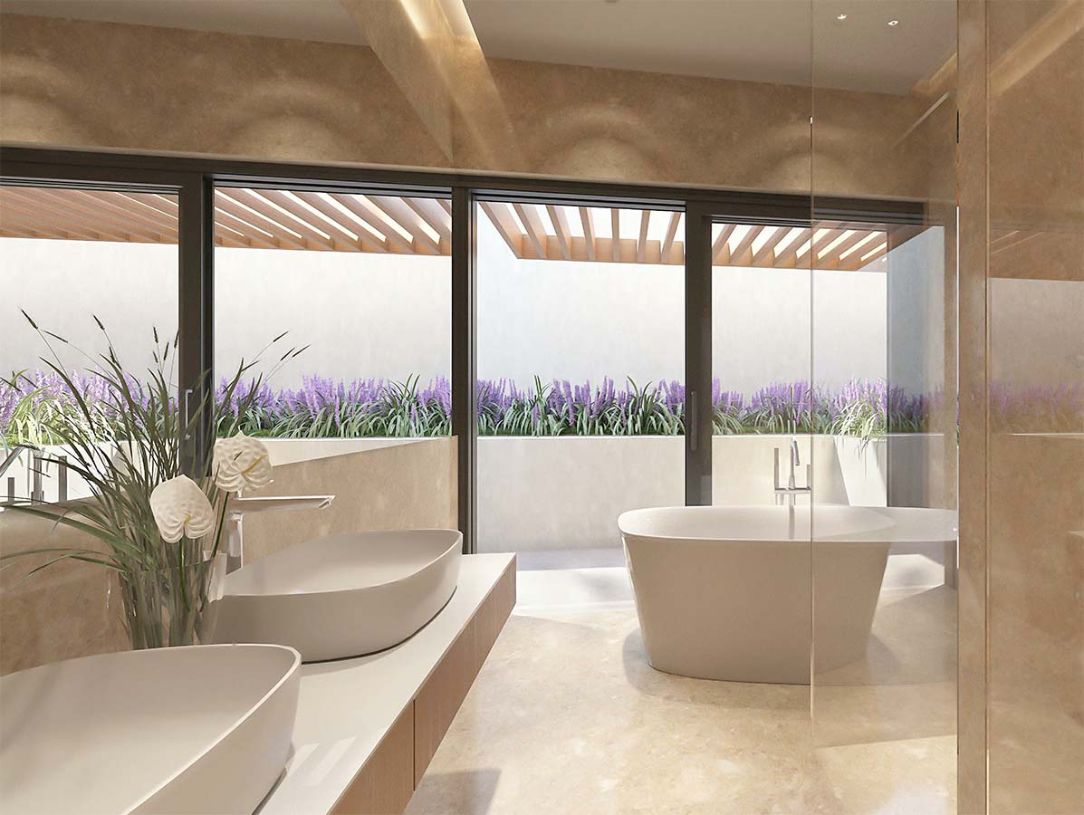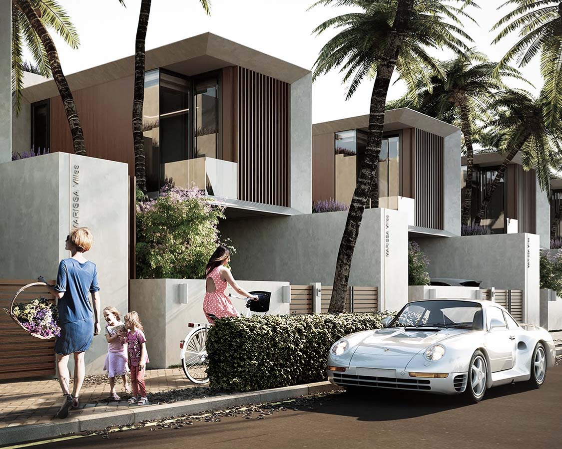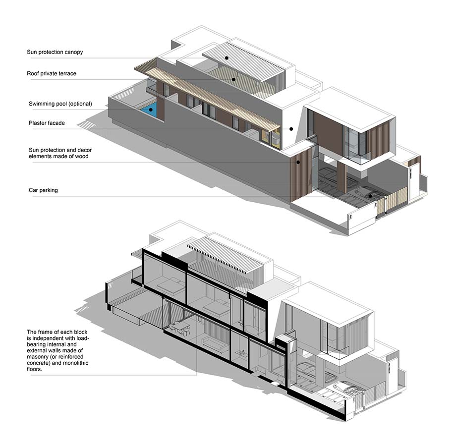 Застройка сформирована на основе лаконичных решений с учетом местной специфики и традиций. Комплекс создан на основе типового жилого модуля, при этом каждый клиент имеет определенный набор индивидуальных опции для своего жилища. Объемно-пространственная композиция блоков, наличие открытых и приватных зон, освещенных и теневых участков позволяет создать комфортную жилую среду.
